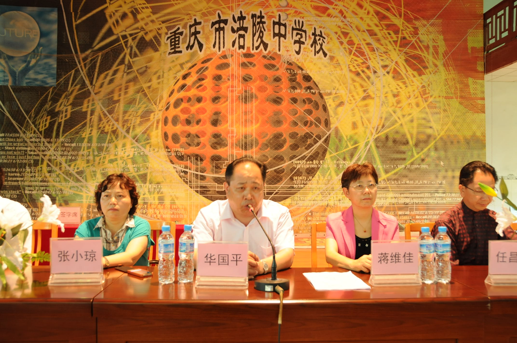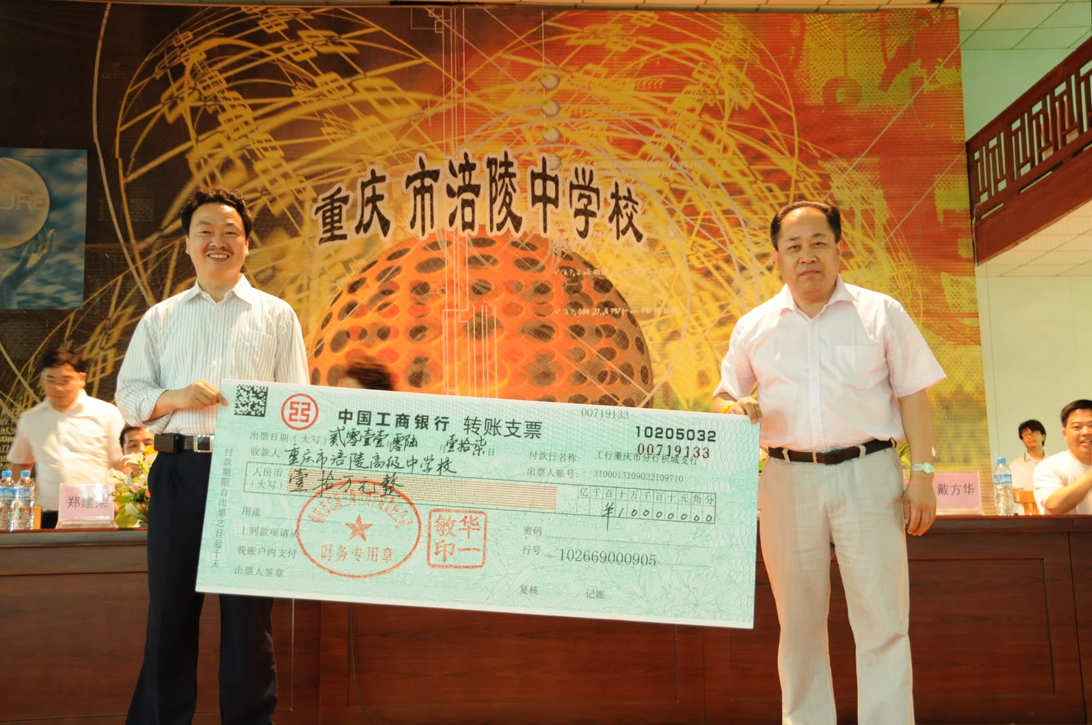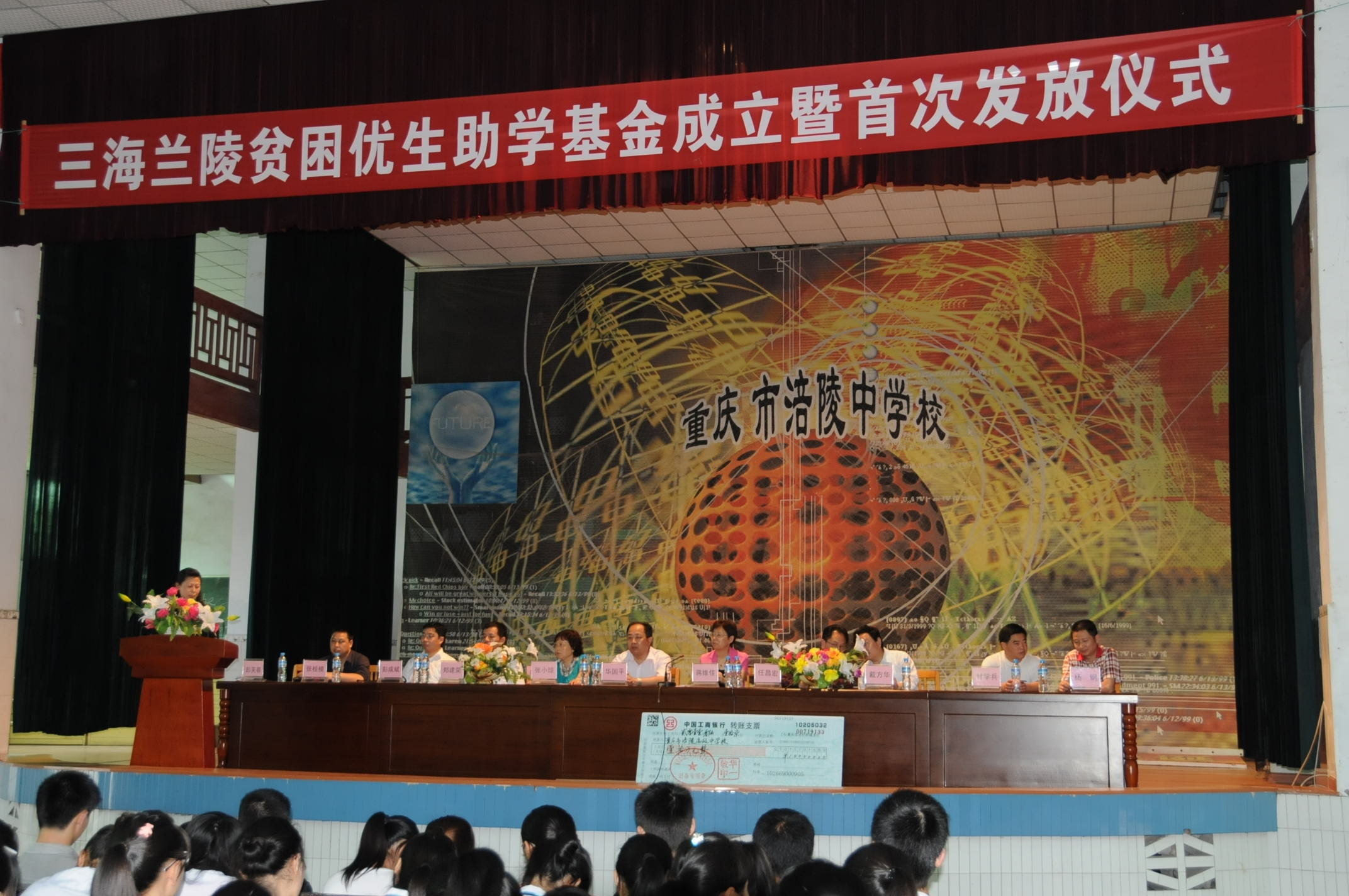 我公司华国平董事长、张小琼副总经理、郑建荣副总经理,涪陵区政协蒋维佳副主席、涪陵区纪委教育工委任昌宏书记,涪陵高级中学校方主要领导等出席发放仪式。