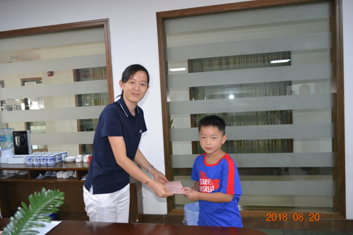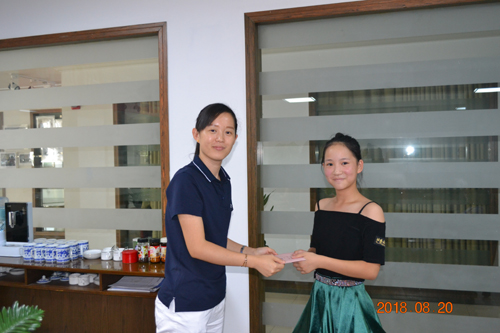 行政人事部经理胡静为员工子女颁发奖金