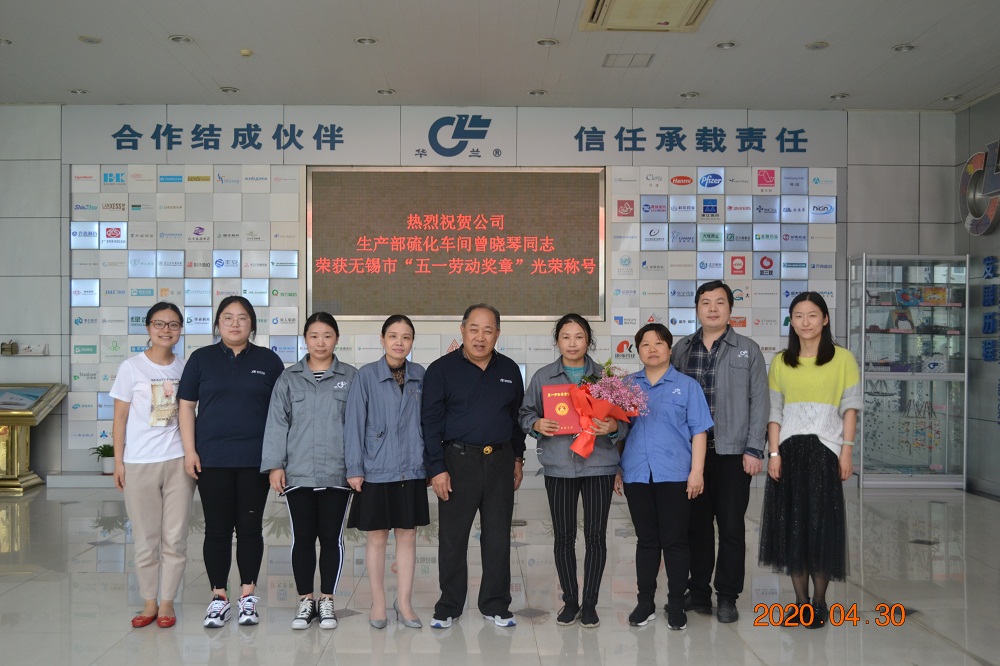 2020年4月30日,在无锡市总工会召开的“五一劳动奖章”表彰大会上,公司生产部硫化车间曾晓琴同志荣获无锡市“五一劳动奖章”光荣称号。