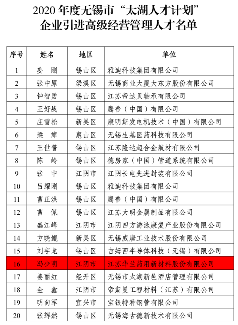 喜讯一:近日,2020年无锡市“太湖人才计划”入选名单正式公布,我司质量总监冯少明先生荣幸入选。