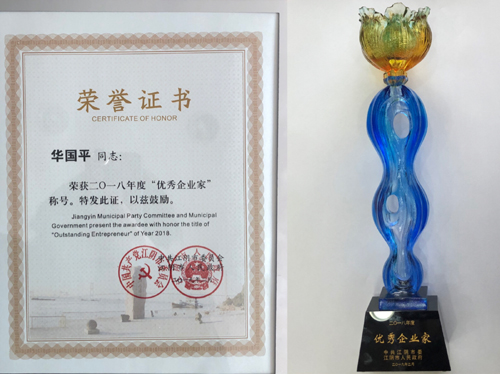 表彰会上,公司董事长华国平先生荣获2018年“江阴市优秀企业家”称号,全市共评选表彰优秀企业家35名。